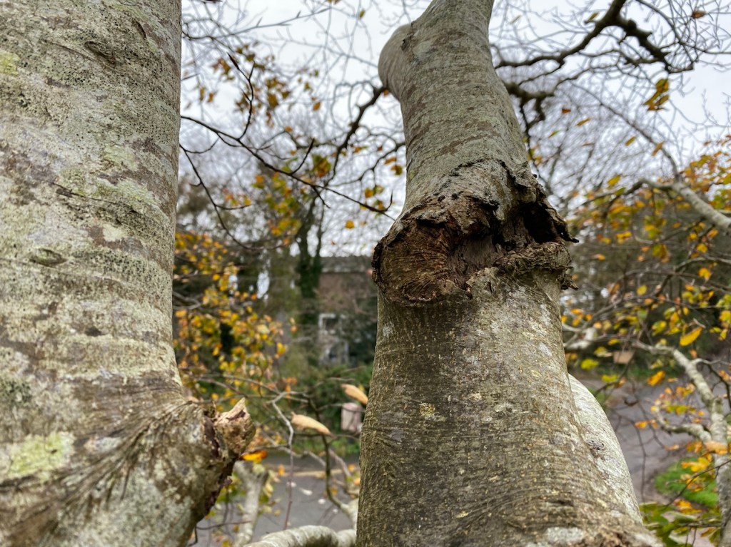 Rubbing branches are a very common issue with Beeches. If left unattended, one of the branches will usually ‘win’, and one will ‘lose’, leading to a branch or limb failing, and ultimately falling. In a woodland this rarely causes an issue, and is part of the natural life cycle of the Beech. If however, there is a greenhouse or a footpath below, damage or injury could occur.