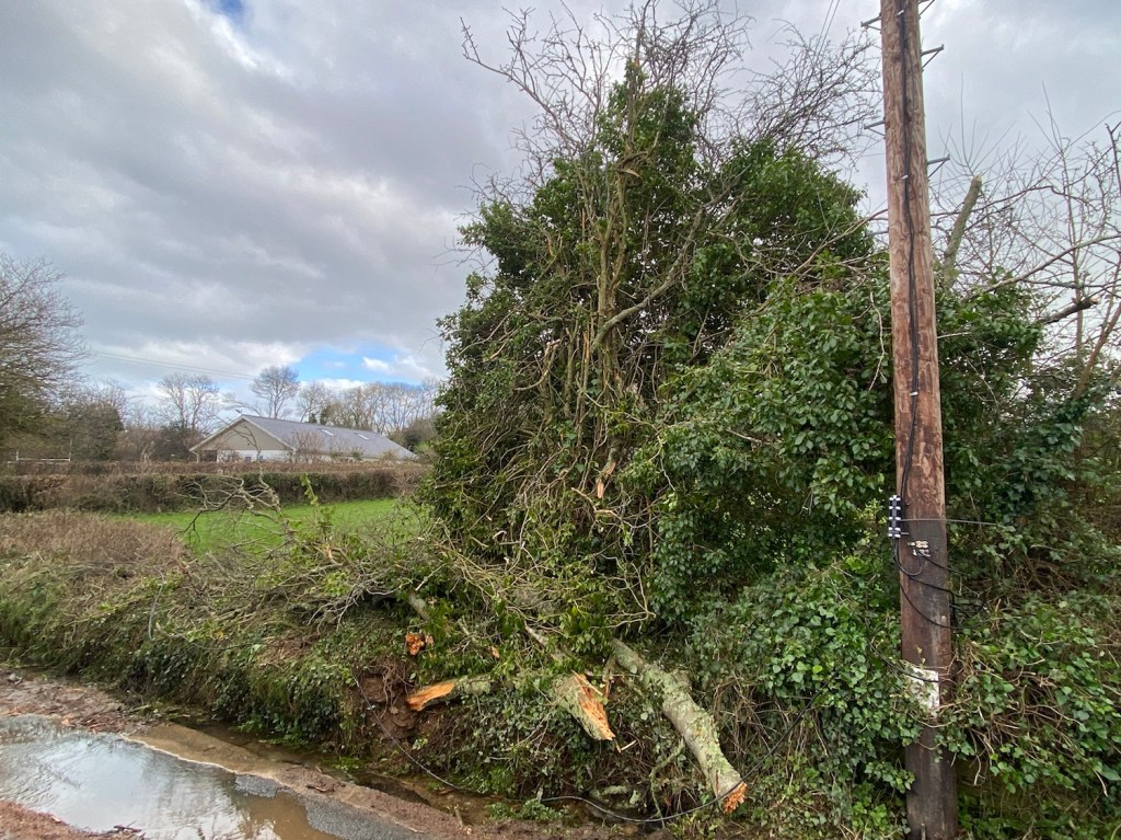 When the old boy failed, the crown completely blocked a (luckily) quiet lane in Chillington, and the only casualties were a BT cable and telegraph pole. A council approved contractor attended in the afternoon to clear the road, and Openreach made a temporary fix to get local residents back online.